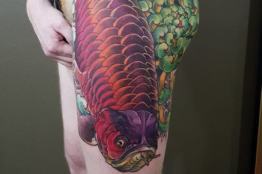 Hình xăm cá huyết rồng là mang đậm phong cách Á Đông, đây chính là điểm tựa tâm linh biểu thị sự may mắn, tài lộc cho chủ sở hữu. Xăm ngay hôm nay nếu bạn là người yêu thích những hình xăm nghệ thuật nhé!